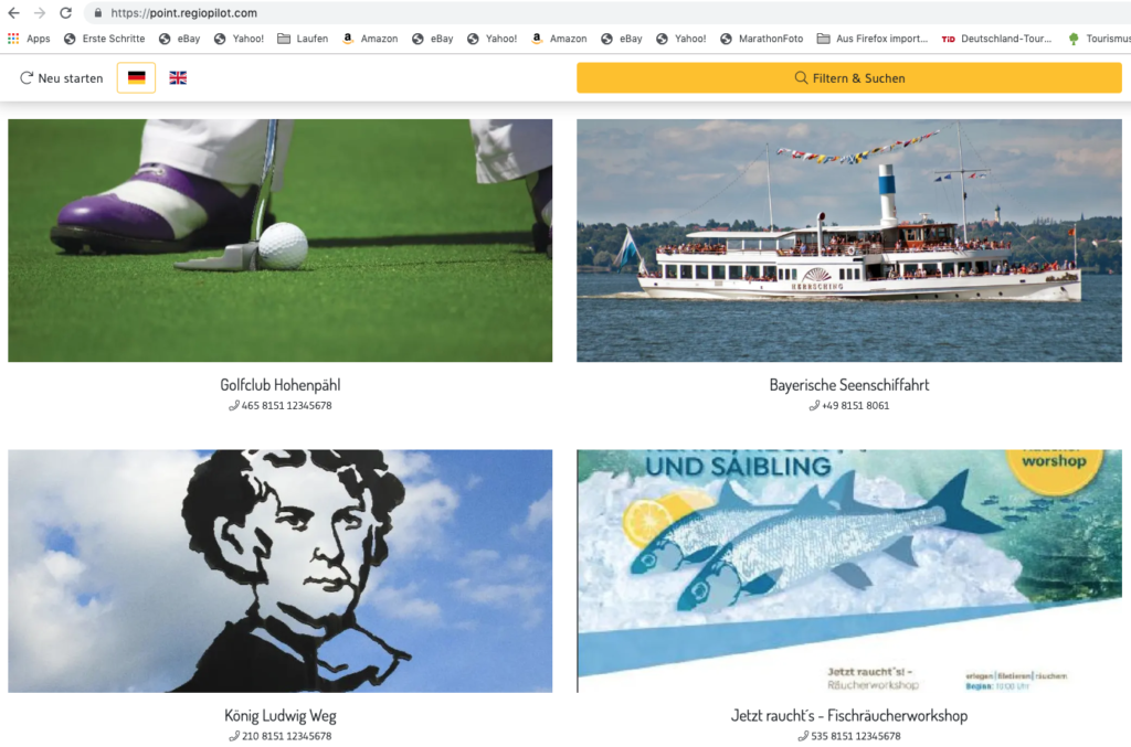 Für Regiopilot hat sich ein kleines, aber feines Team gefunden aus Suchmaschinen-Redakteuren, Vollprofi-Entwicklern und Datenbankspezialisten. Im Rahmen des Pilotprojekts werden wir in einer oberbayerischen Region eine Lösung erarbeiten, die es z.B. dem Counter ermöglicht, rasch auf strukturierte Info zurückzugreifen und diese an den Gast an einem Endgerät weiter zu leiten. Auch bei Nichtkenntnis des Angebots einer Region können z.B. ortsfremde Hotel-Rezeptionisten, Mitarbeiter in den Tourist Offices oder Tourenanbieter, Wirte und Hoteliers dem Gast den perfekten Überblick über die gewünschten Points of Interests bieten. Die ersten Demoversionen laufen unter www.demo.regiopilot.com und point.regiopilot.com. Gerne geben wir Ihnen einen Zugang zum (bereichsgeschützten) Frontend. Mehr Allgemeines erfahren Sie hier über Regiopilot.